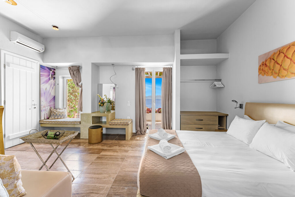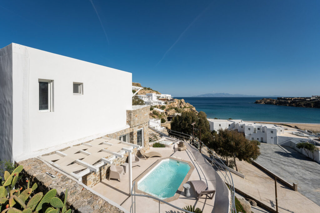 Pocket gardens crammed with bougainvilleas and scented indigenous plants provide shade and striking colours that best fit the Mykonian aesthetic. Outdoor shower areas at entrances enable easy transition from beach to indoors. The vibe is complete with a visit to the pool and recreational pool area with unlimited sea view enjoyed by all guests.